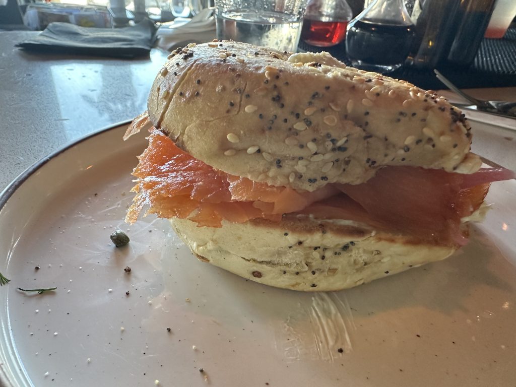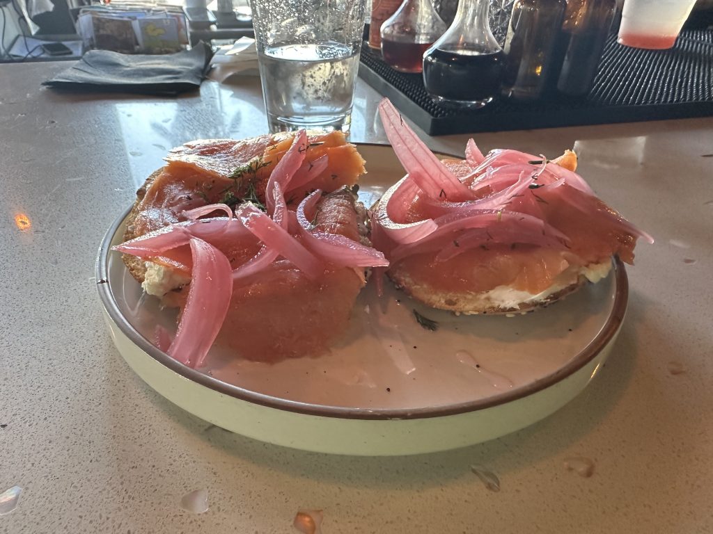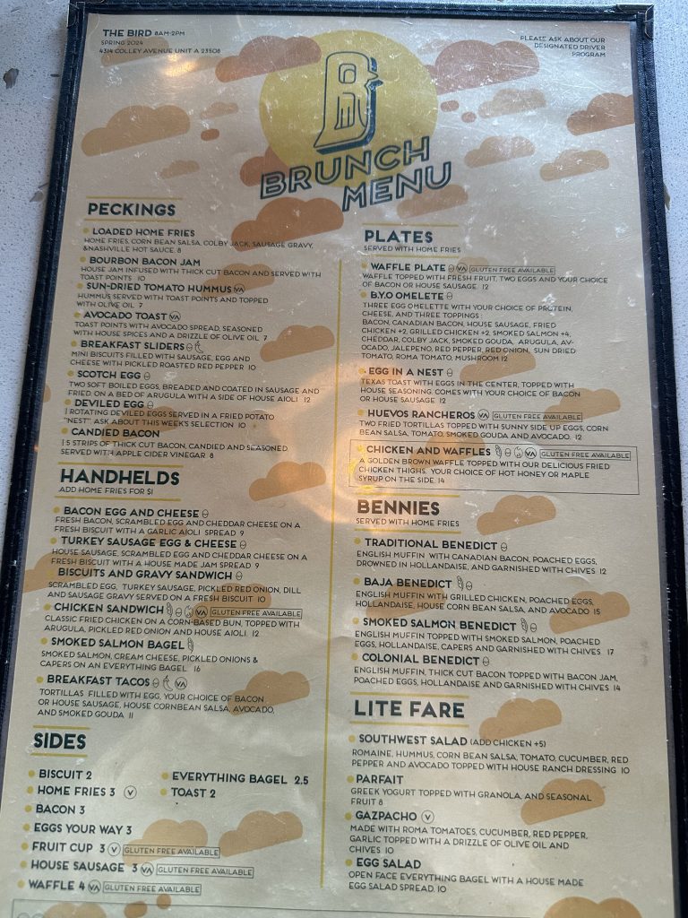 We stayed right next door to Chartway Arena, Old Dominion’s Basketball arena, and it looks absolutely amazing lit up at night. The next morning, we walked over to The Bird, a breakfast spot a few blocks from our hotel that had some of the outskirts of campus as a backdrop for our walk. The Bird was great! They have table/bar seating cards instead of order numbers, and each card is a picture of a famous “bird.” We were Goose from Top Gun, but I have to admit I was hoping to get Larry. I had a great Salmon Lox Bagel and Ashley had the The Colonial Eggs Bennie. Fun place!