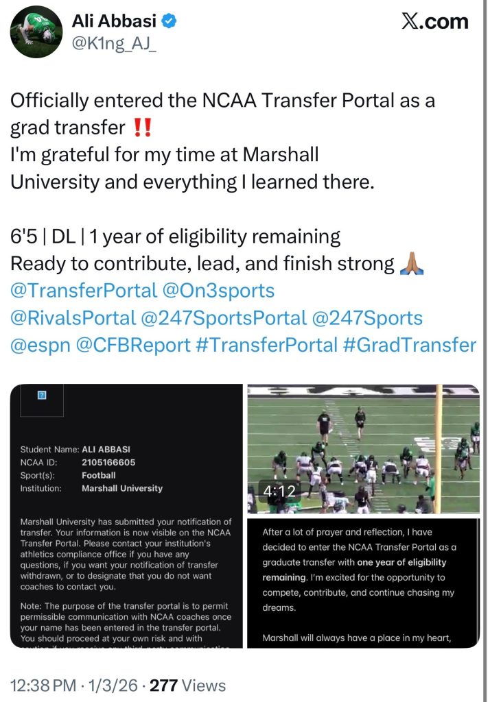 Abbasi transferred to Marshall for the 2025 season from Roosevelt University. He had no stats for the season, and reports that he has one season of eligibility remaining. Abbasiโs 12/24/2025 announcement on Twitter is below. Confirmed entry in the portal on 1/3/2026. Committed to Robert Morris on 2/4/2026.