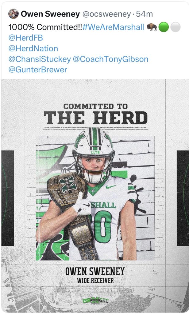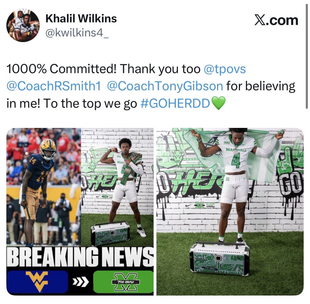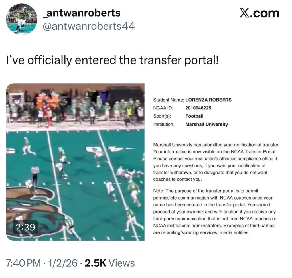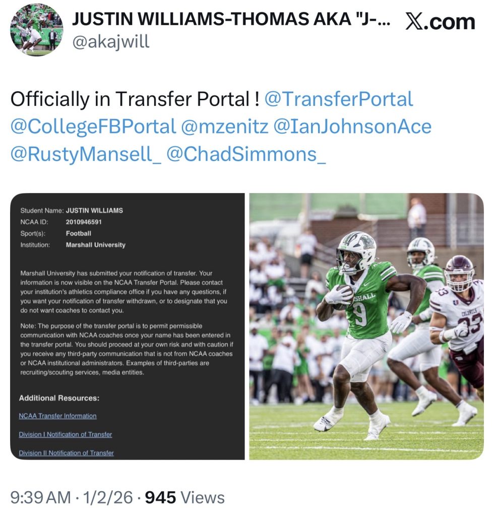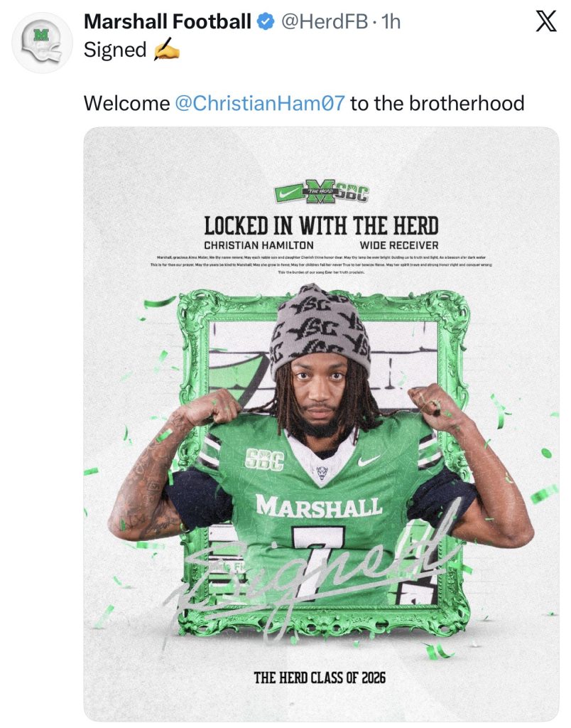 Hamilton spent two seasons at North Carolina before transferring to WVU for the 2025 season. He had 3 catches for 20 yards last season. Out of high school, Hamilton’s offers as the 55th-ranked wide receiver in the country were a veritable “who’s who” across the SEC, ACC, Big 10, Big 12, and others. He has two years of eligibility remaining. Hamilton’s commitment confirmation by Marshall on Twitter on 1/15/2026 is below.