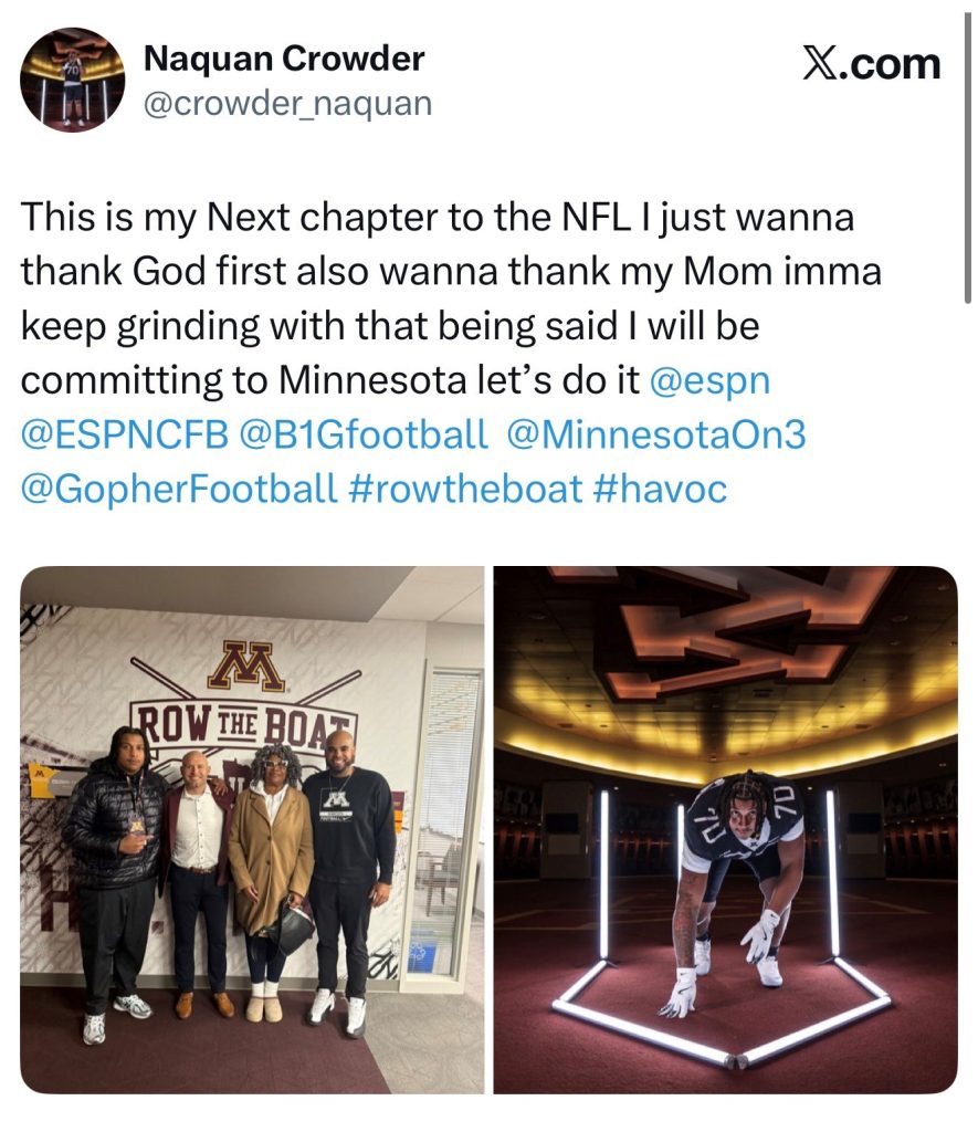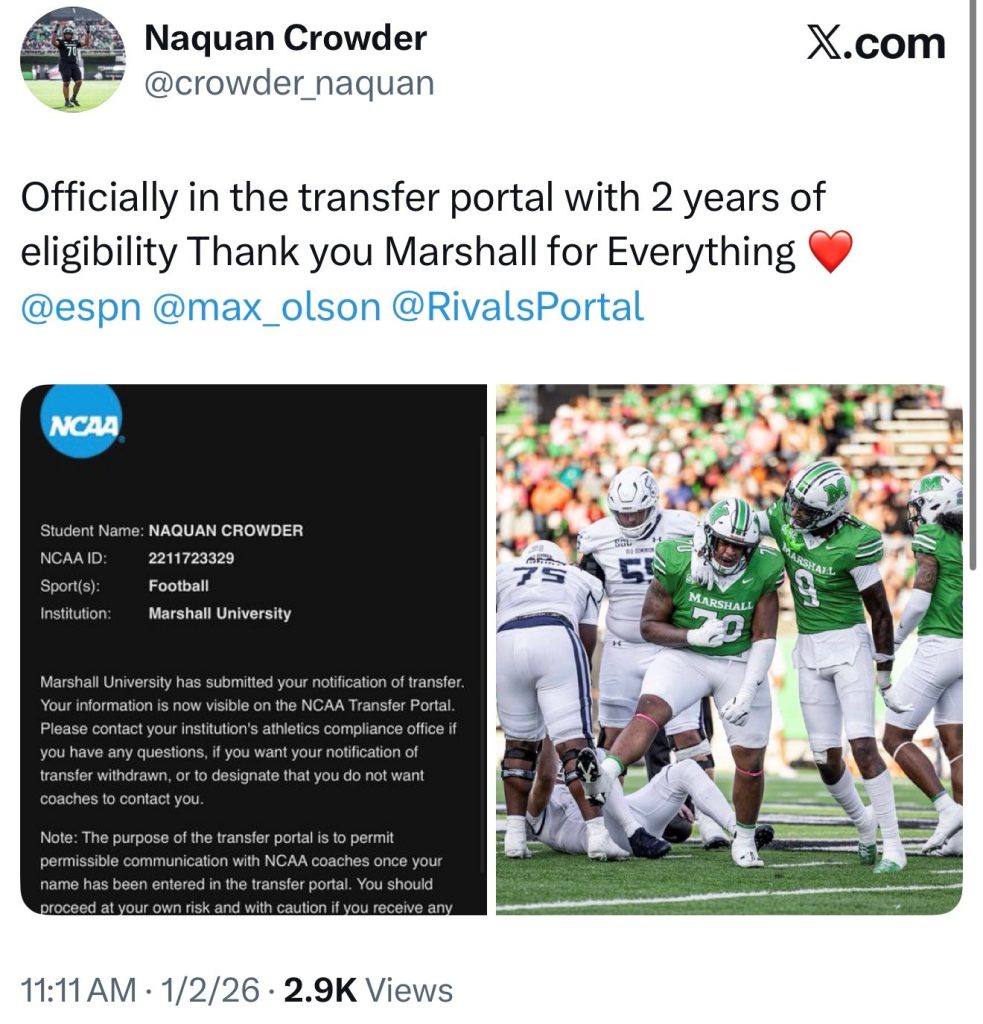 Crowder transferred to Marshall from California University of Pennsylvania for the 2025 season. He started two games in 11 appearances for Marshall and recorded 26 tackles, 1 sack, and 3 tackles for loss. Crowder has two years of eligibility remaining. His announcement of officially entering the transfer portal on Twitter on 1/2/2026 is below. Committed to Minnesota on 1/5/2026.