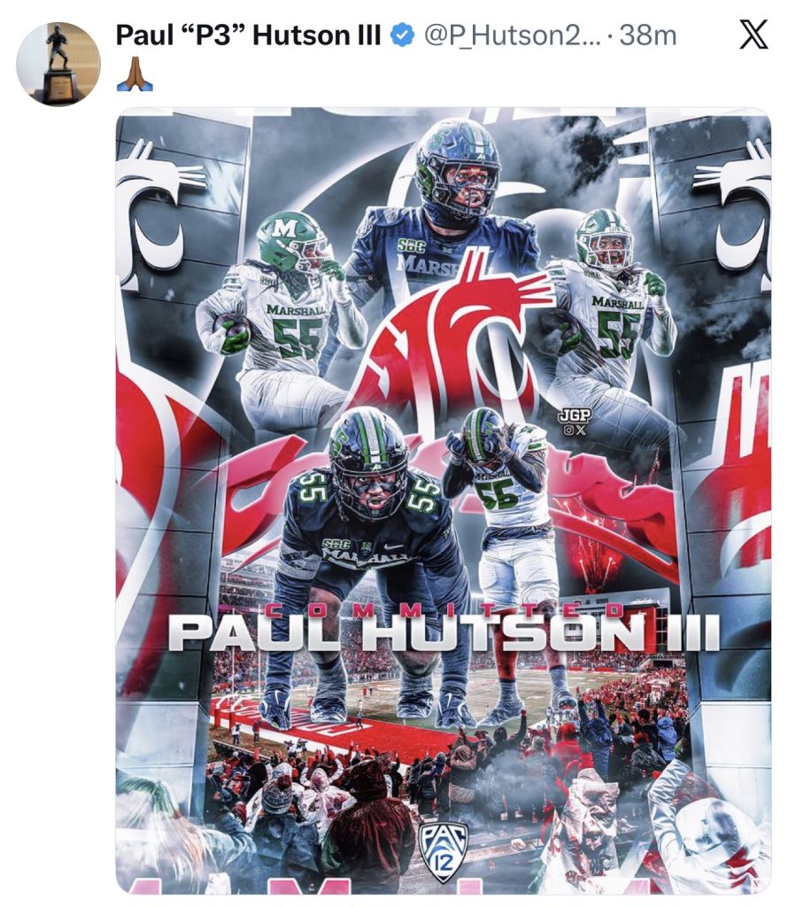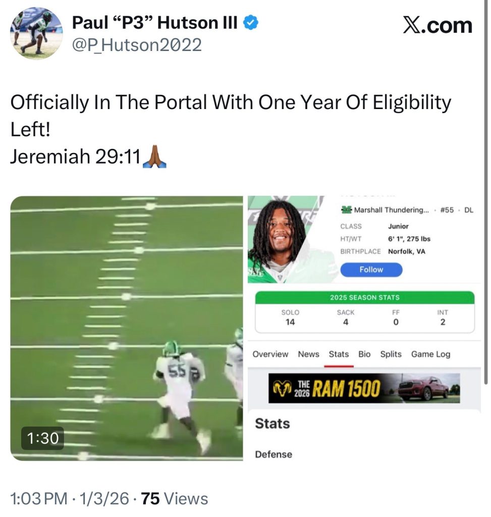 Hutson III transferred to Marshall from Campbell for the 2025 season after also spending a season at Austin Peay. He amassed 40 total tackles (13 solo) with 4.0 sacks and seven Tackles for Loss. He also had two INTs as a Defensive Lineman, taking one back for a Touchdown. Hutson III should have one season of eligibility remaining. His repost of the report of his agents announcing his portal entry on 12/23/2025 on Twitter is below. Confirmed entry in the portal on 1/3/2026. Committed to Washington Sate on 1/12/2026.