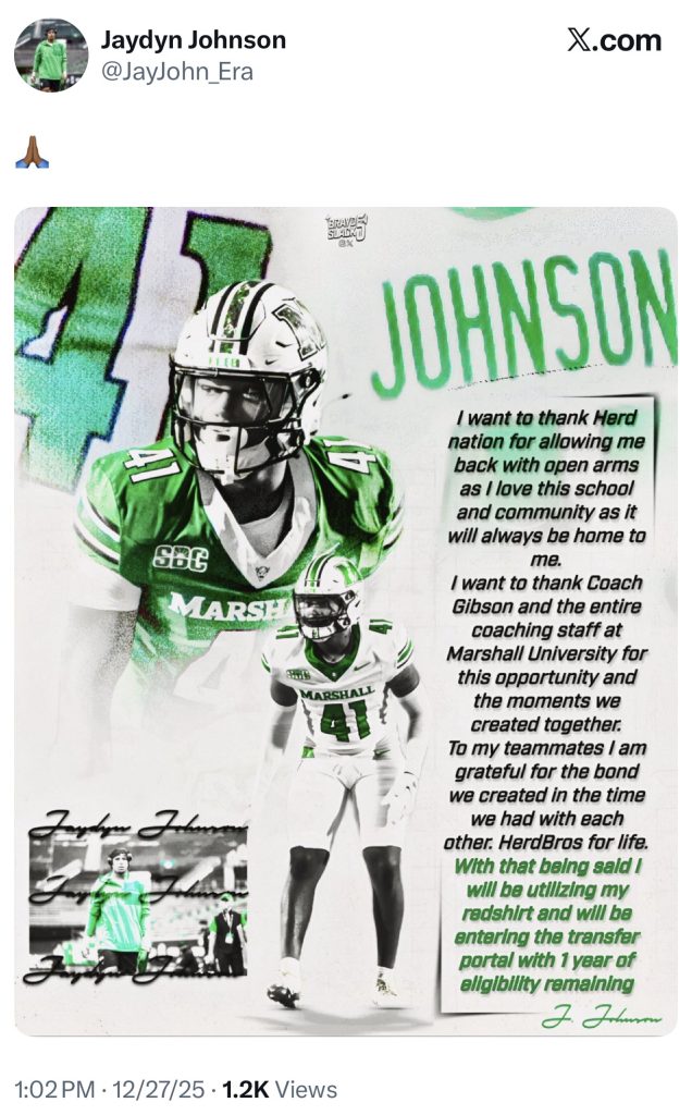 Johnson transferred back to Marshall for the 2025 season from Lindenwood where he was at for two seasons. Prior to that, the former Cabell Midland player had spent his first years at Marshall. Johnson recorded four tackles on the year, all solo, with three coming against Georgia the first game of the year. His 12/27/2025 announcement on Twitter is below. Confirmed entry in the portal on 1/2/2026.