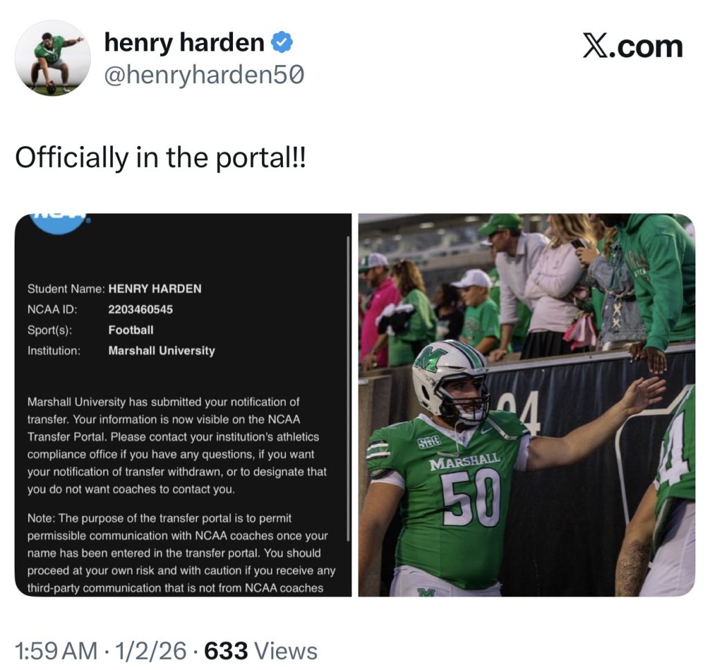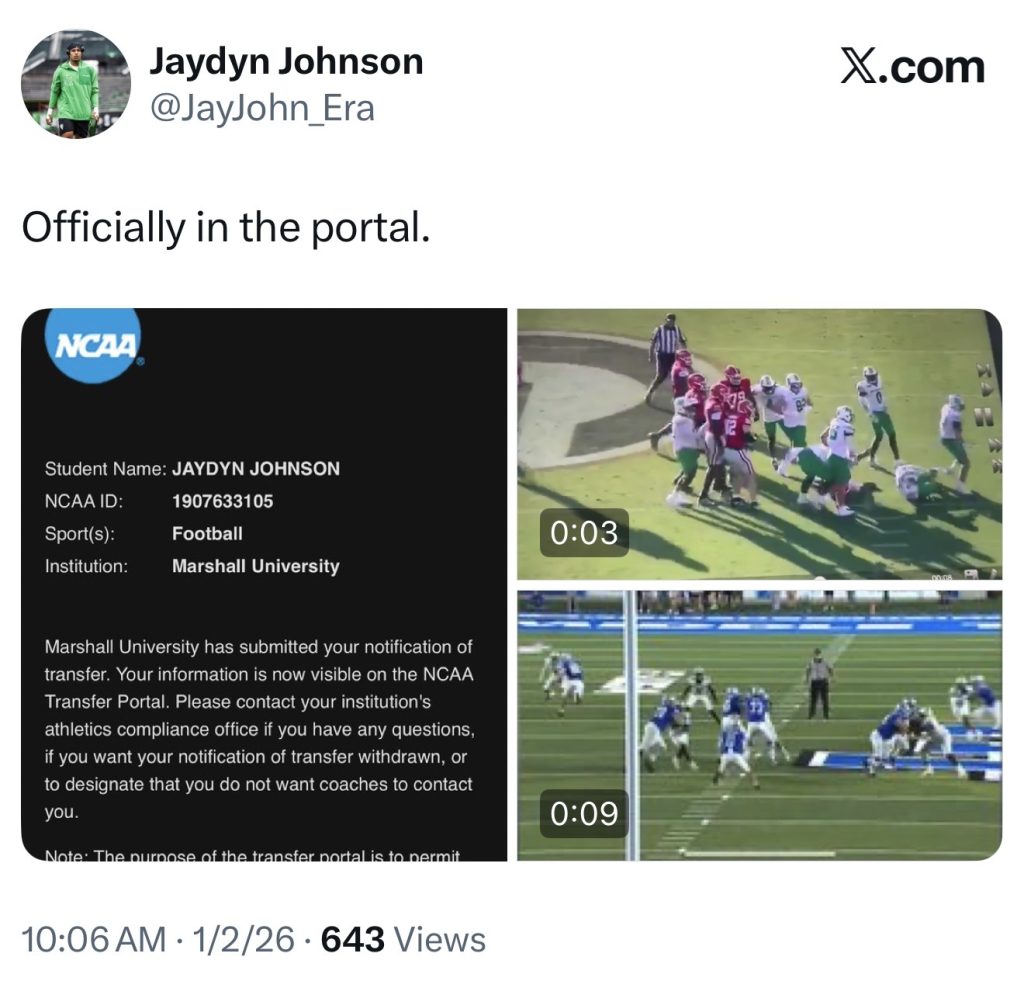 Welcome back for another offseason of craziness! This will be your one stop shop for comprehensive coverage of tracking all the Marshall Football portal movement for the 2025-2026 offseason. There is only one transfer portal window this year (January 2 – 16, 2026), as the spring transfer portal window has been erased by the NCAA. At The ThunderCast, we care about accuracy, not being the first to report something. We may know about a player entering the portal to transfer from Marshall, or a player transferring to Marshall, but until it is announced and confirmed it will not make this list.