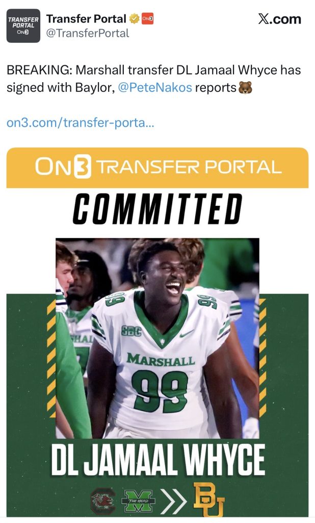 Whyce transferred to Marshall for the 2025 season and finished with 33 tackles, 2.5 sacks, 5.5 tackles for loss, and a fumble recovery. He had been in the portal for several days but there was no confirmation to provide until it was reported that he was committed elsewhere. His commitment to Baylor on 1/7/2026 is below.