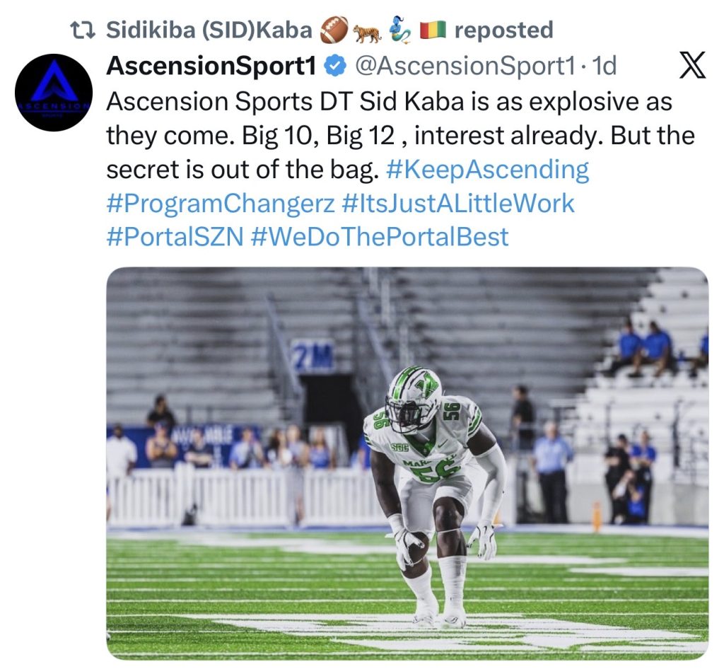 Kaba transferred to Marshall for the 2025 season from Western Michigan. He had 18 tackles (6 solo), half a sack, and 3 tackles for loss for Marshall in 2025. Kaba had been in the portal for several days but had not yet posted a confirmation. His agent has now posted about interest and visits which Kaba has retweeted, such as this retweet below. Committed to Minnesota on 1/11/2026.