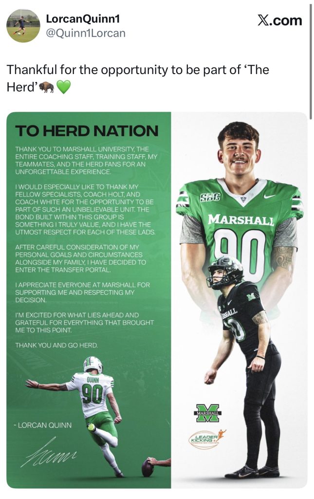 Quinn was not only new to Marshall in 2025, he was new to American Football. The true freshman from Ireland ended up setting several records as a Kicker for Marshall, including but not limited to: most field goals made in a season (21); most 50+ yard field goals in a career (4); most consecutive games of 2+ field goals per game (5). He was also amongst the national leaders in kickoff touchback percentage and average yards per kickoff. To say he was a weapon is an understatement. Quinn has three years of eligibility remaining. His 1/8/2026 announcement on Twitter is below. Committed to Alabama on 1/12/2026.