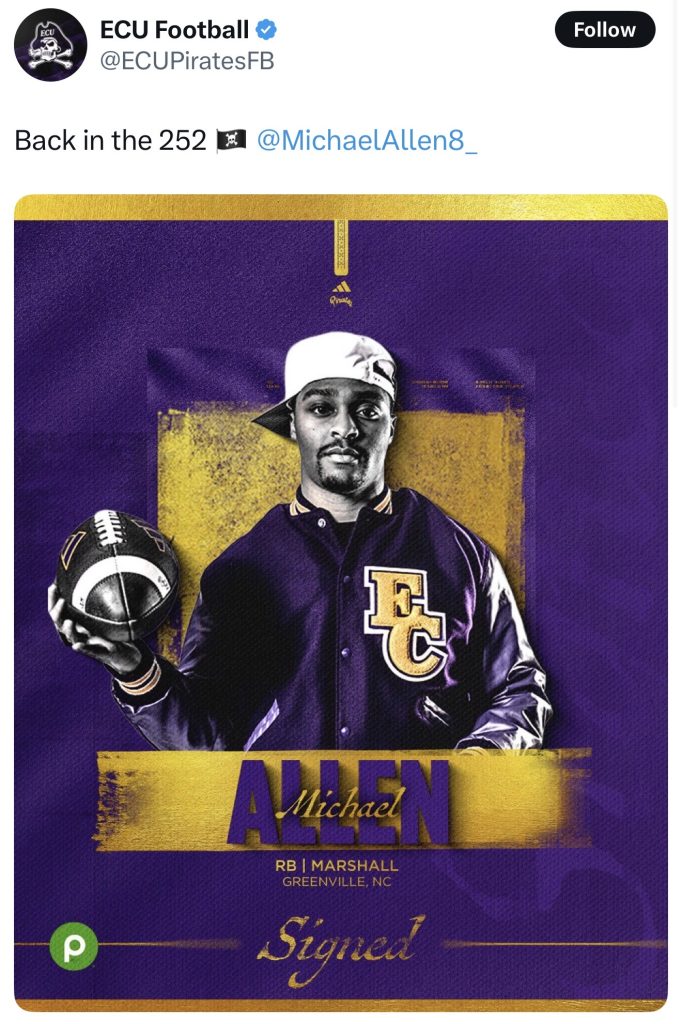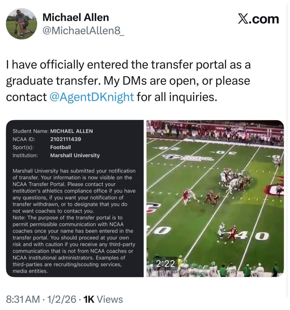 Allen transferred to Marshall for the 2025 season after multiple years at NC State and a partial season at UNLV. For The Herd, he had 77 carries for 385 (5.0 avg) yards and 4 TDs. Through the air, he added 12 receptions for 139 yards (11.6) and another score. He enters the portal as a graduate transfer with one year remaining. His 12/4/2025 announcement on Twitter is below. Confirmed entry in the portal on 1/2/2026. Committed to ECU on 1/8/2026.
