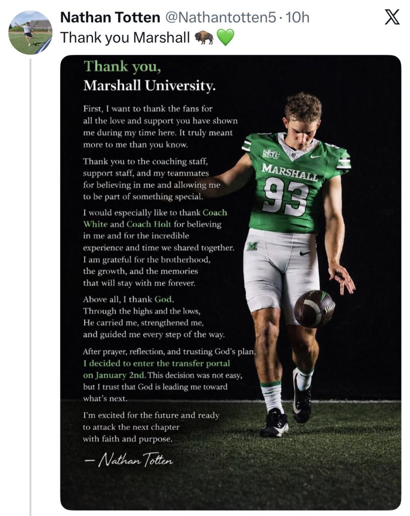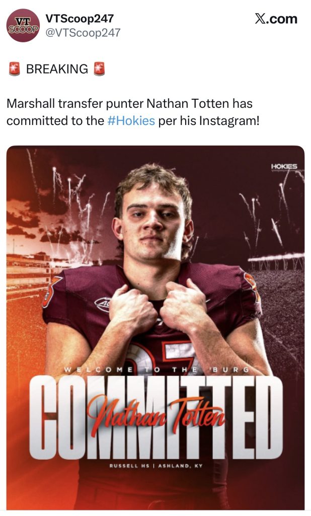 Totten played two years at Marshall after committing to Marshall out of high school from Ashland, KY. In 2024, he filled in as kicker for field goals on occasion when the starter was out, and also handled punting kickoff duties at times. Transitioning to full-time punter for the 2025 season, Totten flourished with a Marshall record 45.6 yards per punt. He will have two years of eligibility remaining. The 1/8/2026 announcement on Twitter is below, as well as his commitment to Virginia Tech on the same day.