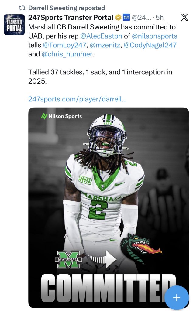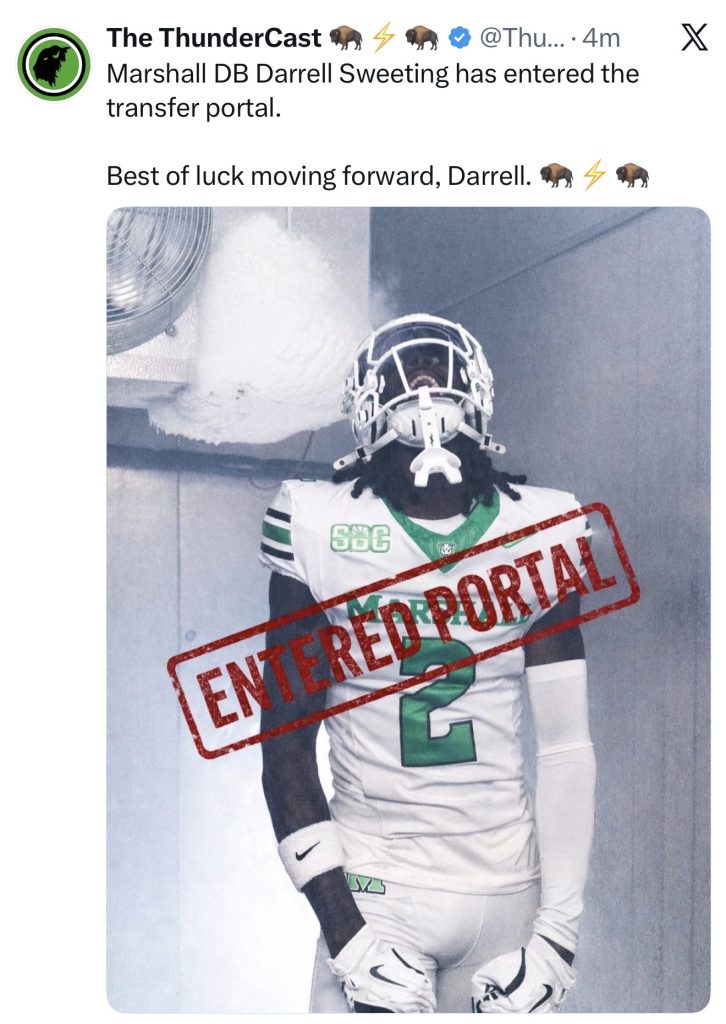 Sweeting transferred to Marshall from Maryland for the 2025 season. He played his way into the starting lineup for the second half of the season, with five starts at cornerback. Sweeting has 37 tackles (22 solo), with 1 sack for his 1 tackle for loss, and 1 interception. The ThunderCast’s 1/9/2026 announcement on Twitter is below. Committed to UAB on 1/10/2026.