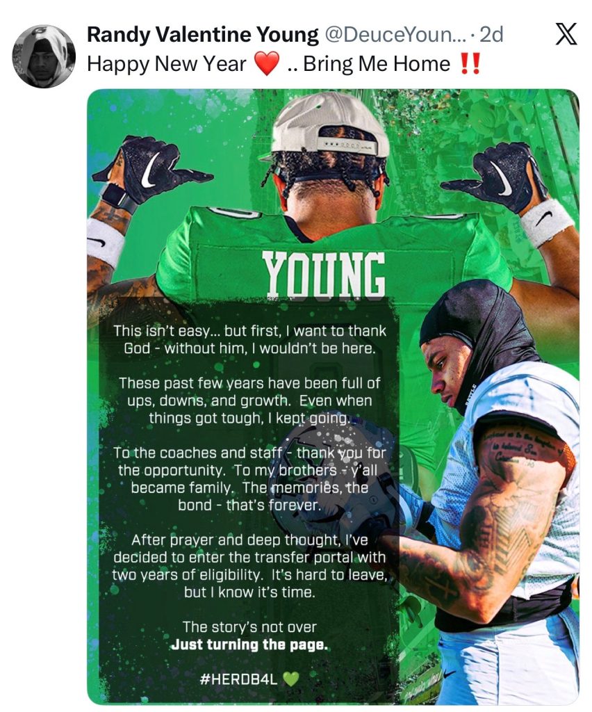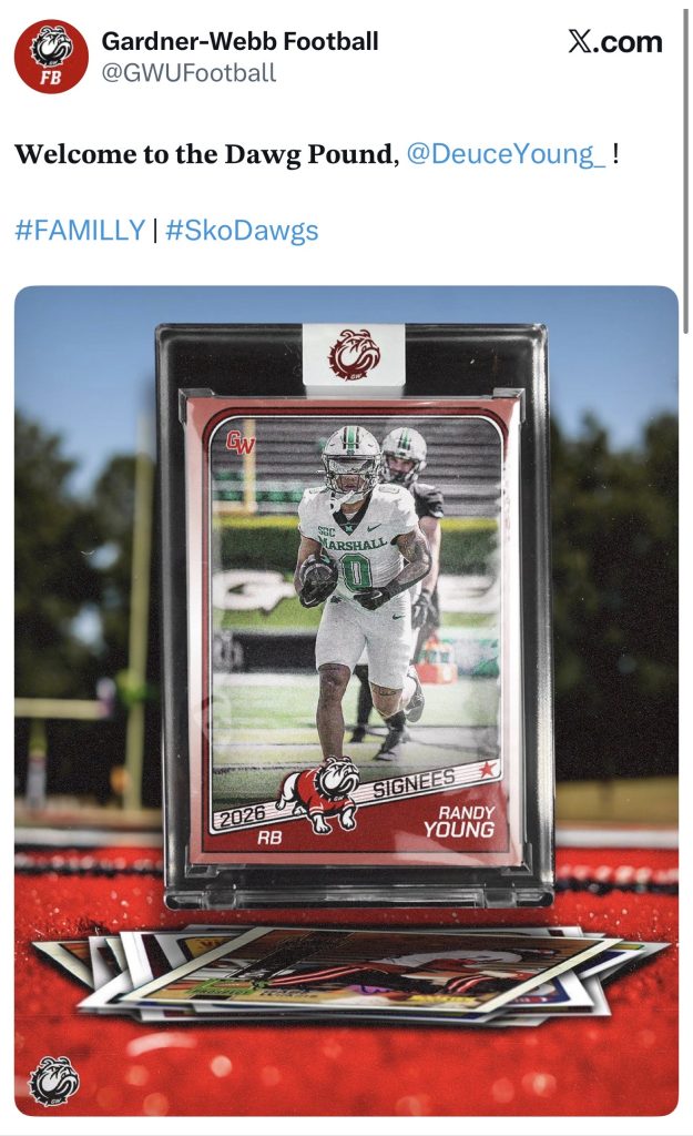 Young transferred to Marshall just prior to the 2023 season from College of DuPage. He had zero carries as a member of the Thundering Herd, but did see action on special teams in the 2023 Frisco Bowl. Young entered the portal following the 2025 Spring Game, but has now announced his re-entry while not being on the 2025 roster. It is unclear if he was totally off the roster in 2025 or was on the practice squad. His 12/12/2025 announcement on Twitter is below. Young retweeted his April 2025 official portal entry on 1/2/2026 as it is still valid, and also posted an updated message to Marshall fans and the team which is also below. Committed to Gardner Webb on 1/9/2026.