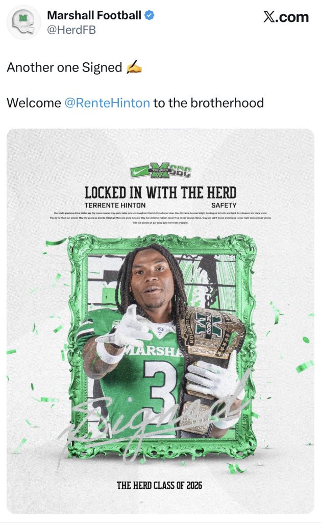 Hinton was at NC State the past three seasons but did not play in 2025. Had 13 tackles (5 solo), and 1 pass defended as a reserve, playing in 12 games on defense and all 13 on special teams. Had offers from Indiana and many fellow Sun Belt teams out of high school. Hinton should have one year of eligibility remaining. The 1/13/2026 announcement of his commitment by Marshall on Twitter is below.