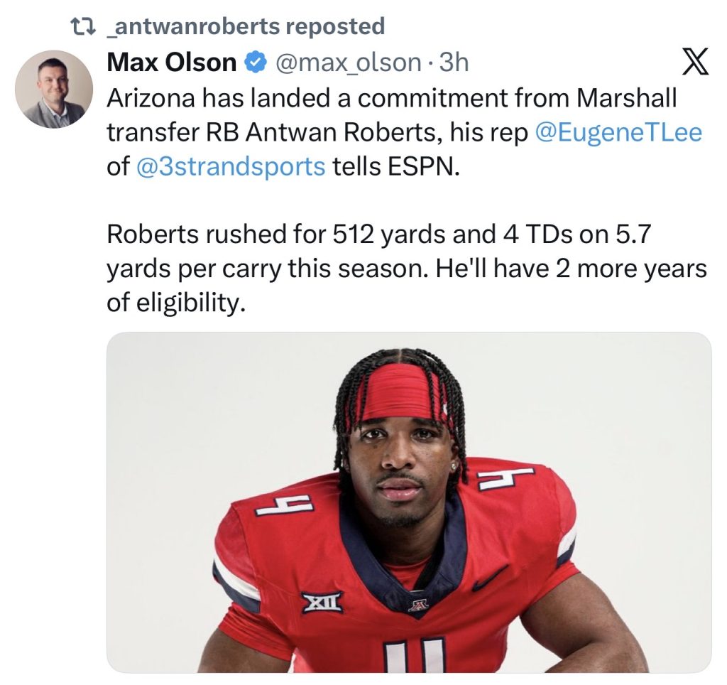 Roberts rushed 90 times for 512 yards (5.7 avg) and for TDs in 2025 after missing all of 2024 with an injury. He added 7 receptions for 58 yard (8.3 avg) in the passing game. His breakout games were in back to back weeks as he rushed for 134 yards at Coastal Carolina and followed it with 121 yards against JMU. Roberts made his announcement on Twitter on 12/2/2025, which is below. Confirmed entry in the portal on 1/2/2026. Committed to Arizona on 1/14/2026.