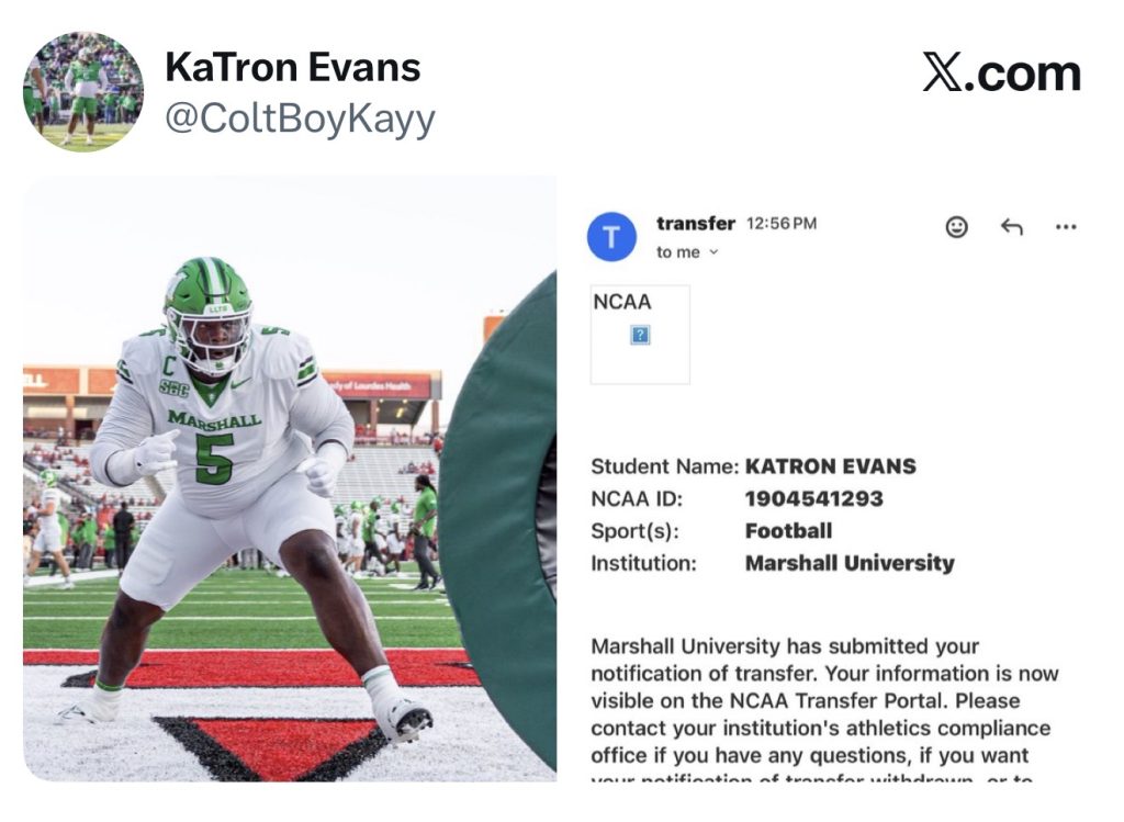 Evans transferred to Marshall for the 2025 season from Charlotte. He had 12 tackles (5 solo) and 1.5 tackles for loss for Marshall last season. Evans is currently petitioning the NCAA for one final year of eligibility. His 1/15/2026 announcement on Twitter is below. Committed to NC State in 1/20/2026.