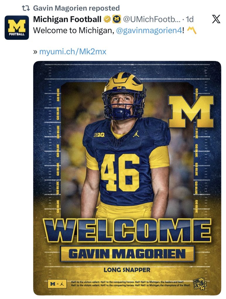 Magorien played all 12 games as a freshman for Marshall in 2025. Though longsnappers rarely have stats to show, Magorien received a pass for a 12 yard first down from punter Nathan Totten on a fourth down fake. He did not announce his entry into the transfer portal, so his retweet of his 1/15/2026 commitment to Michigan is below.