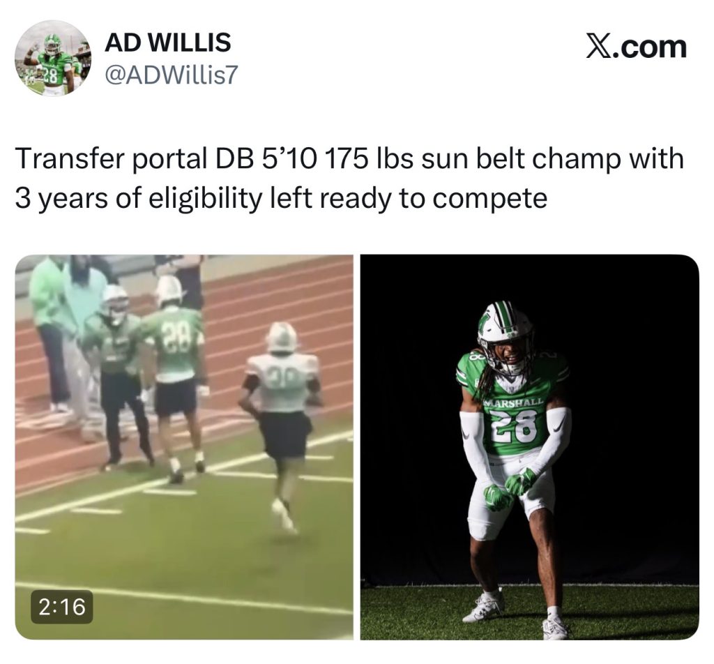 Willis was a redshirt freshman for Marshall in 2025, and has three years of eligibility remaining. He had no stats and may not have appeared in any games. His 1/18/2026 announcement on Twitter is below.