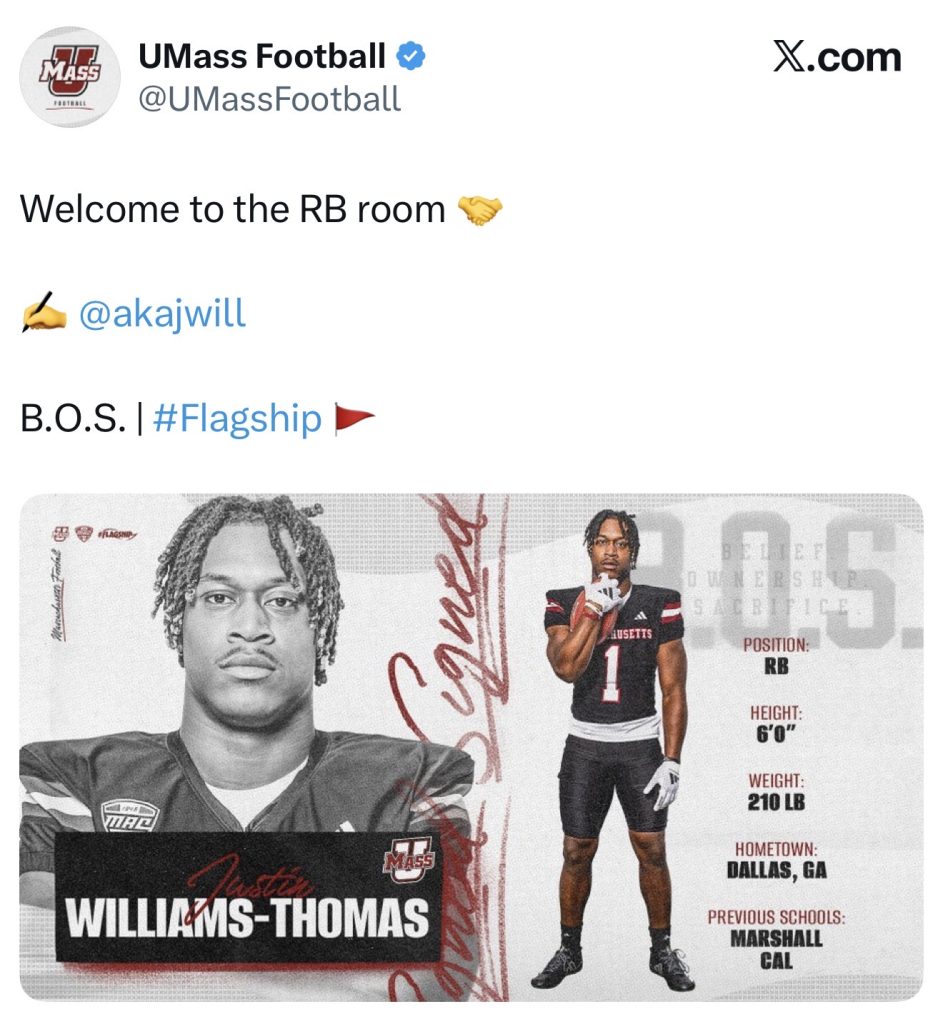 Williams-Thomas transferred to Marshall for the 2025 season after stops at Cal and Tennessee. He had 35 carries for 197 yards (5.6 avg) and 2 TDs while also catching 3 passes for 41 yards (13.7 avg) and another TD. Williams-Thomas enters the portal as graduate transfer and two years of eligibility remaining. His 12/7/2025 announcement is below. Confirmed entry in the portal on 1/2/2026. Committed to UMass on 1/23/2026.