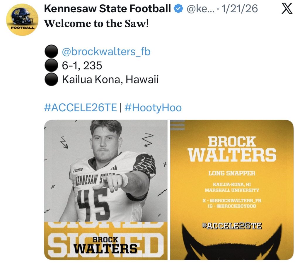 Walters transferred to Marshall for the 2025 season from ODU. He has multiple years of eligibility remaining. His 12/6/25 announcement on Twitter is listed below. Confirmed entry in the portal on 1/2/2026. Committed to Kennesaw State on 1/21/2026.