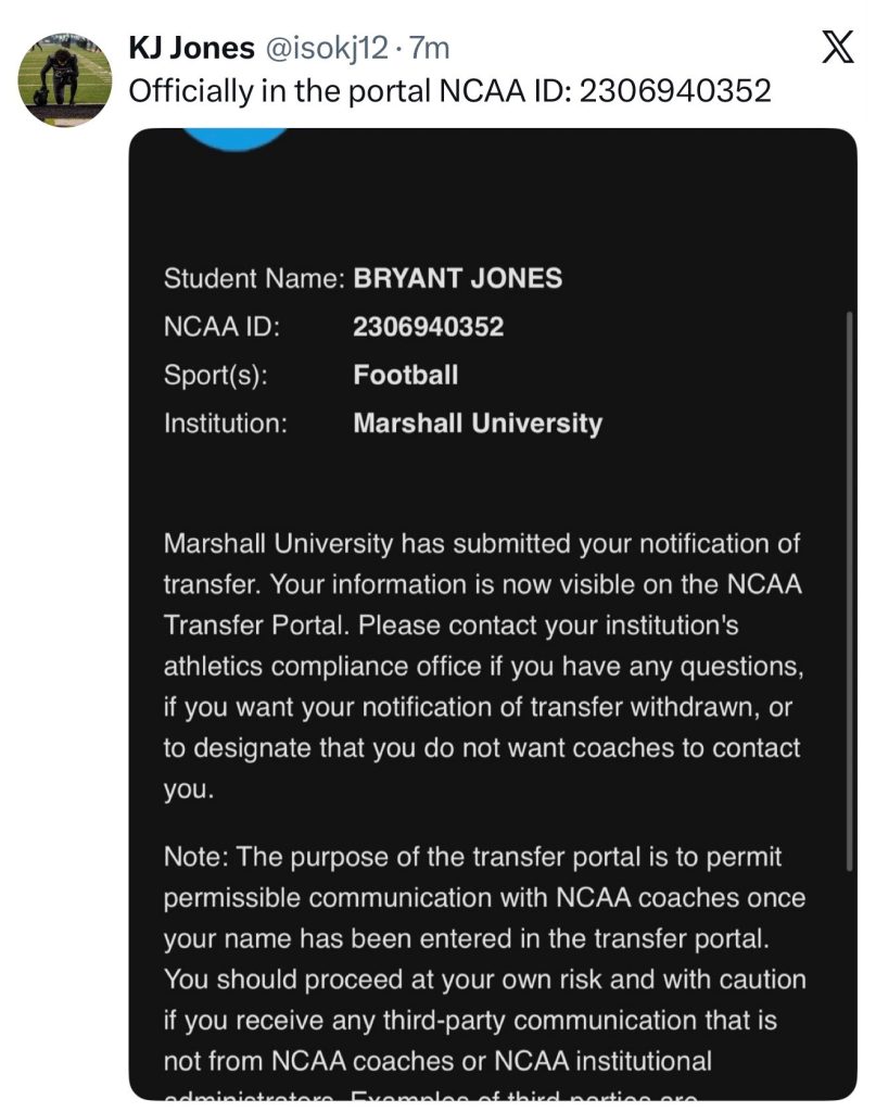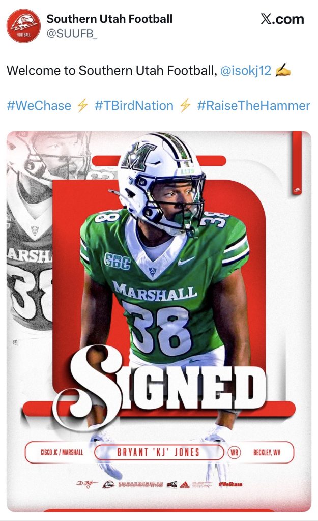 Jones is a wide receiver from Beckley, WV that has no stats during his time at Marshall. Originally signing with The Herd prior to the 2023 season as a JuCo transfer, he has two seasons of eligibility remaining. His 12/18/2025 announcement on Twitter is below. Confirmed entry in the portal on 1/2/2026. Committed to Southern Utah on 2/4/2026.
